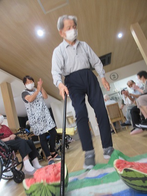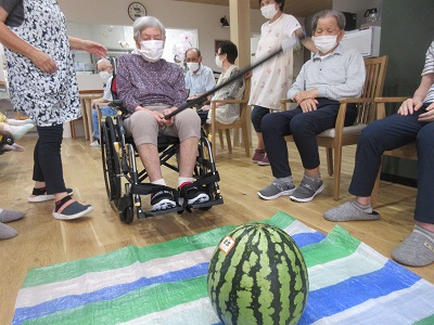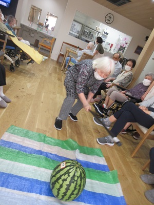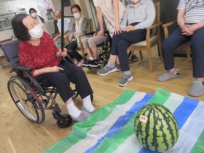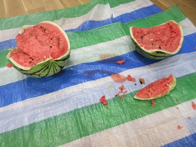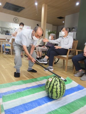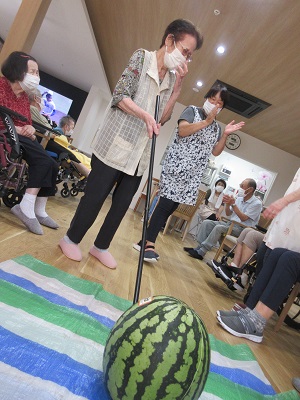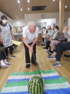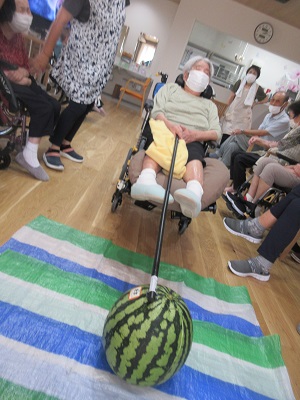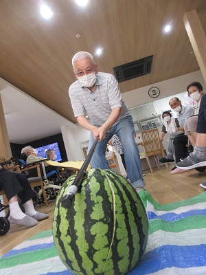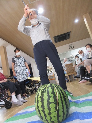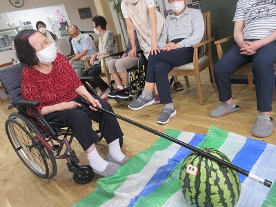 最後の一撃、Kさんの一発で、見事スイカが真っ二つに!!