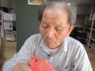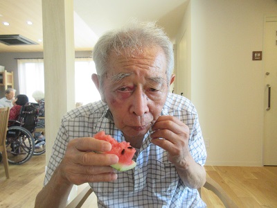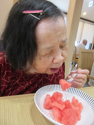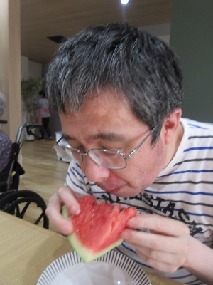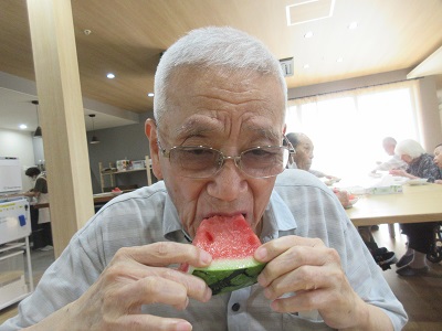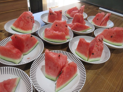 皆さんが、力を合わせて割ったスイカを切り分けて、さぁいよいよ食べてみましょう!
