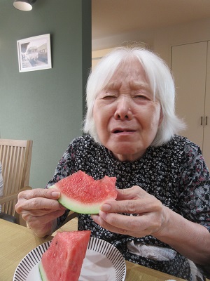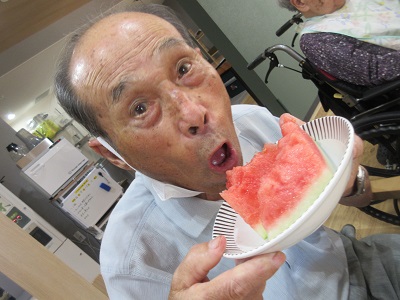 ガブリとかぶりつくと、ジューシーなスイカの実が口の中で溶け広がります!