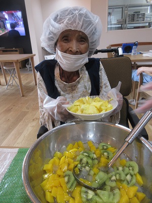 切ったフルーツに缶詰の桃を加えて、そこにサイダーを投入!!