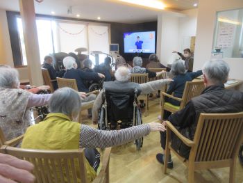 映像にはリズム体操、ストレッチの動作や口腔体操が含まれており、皆さま一緒に取り組むことで、身体を動かす楽しさや達成感を感じていただいています。
