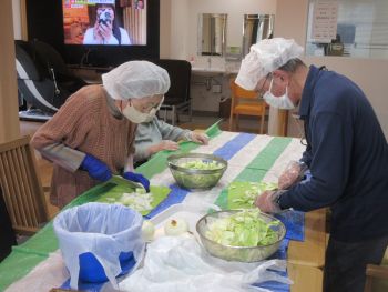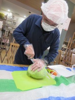 今日は、皆さんで明日の昼ごはんの焼きそばの具材の切込みをしました。