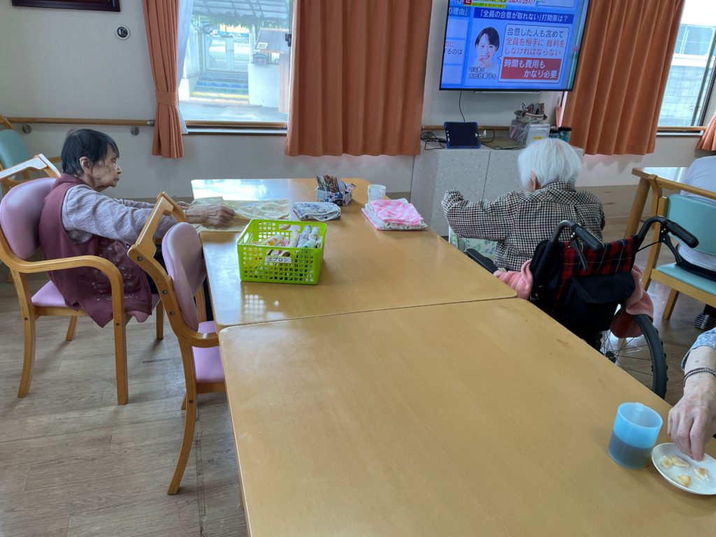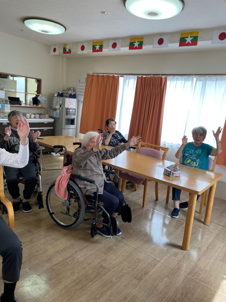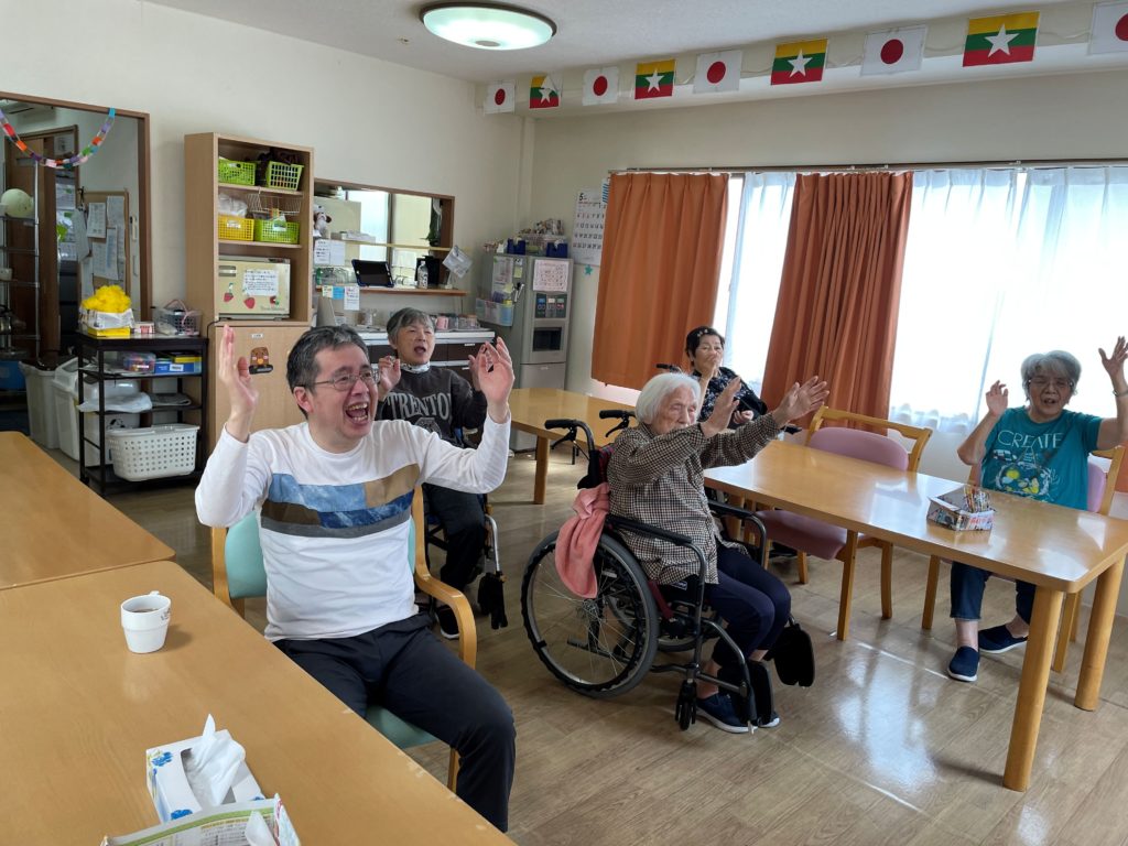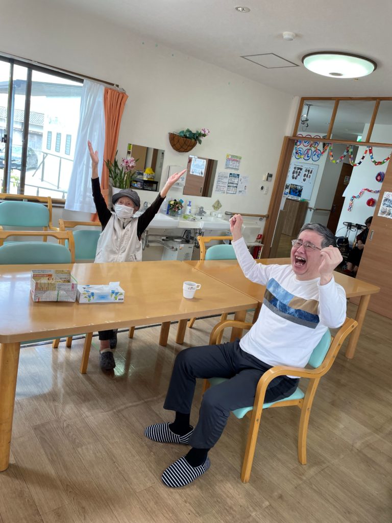 2025.05.23 海の家すずらん 笑いヨガ 今日は皆さまで笑いヨガ 先生の動きに合わせて 「ワッハッハ」と笑います。 「ライオン笑い」「おねだり笑い」 「ジョッキング笑い」など いろいろな笑い方がありましたが 皆さま上手に笑えていました。 「やったーやったーイエイ」と体を動かしたあと エプロンたたみのお手伝いしていただきました。 今日もタメルポイントGetしました!! 記事一覧へ戻る 各施設ごとのすずらん便りはこちらから
