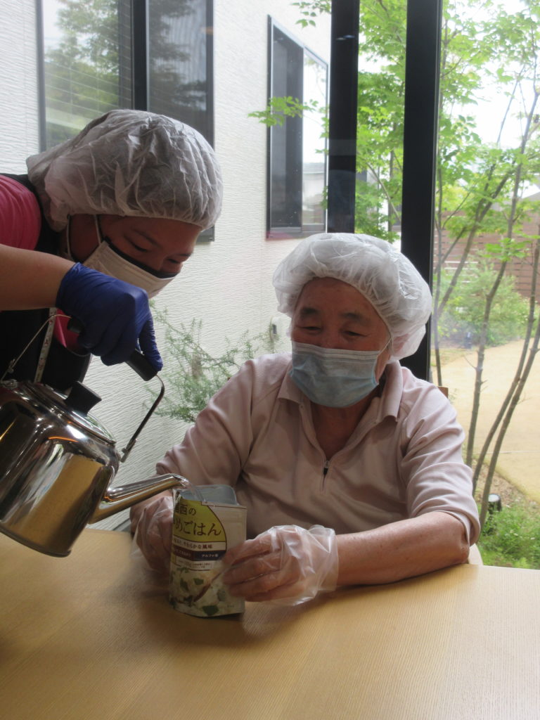 今回も職員がお湯を注ぎ