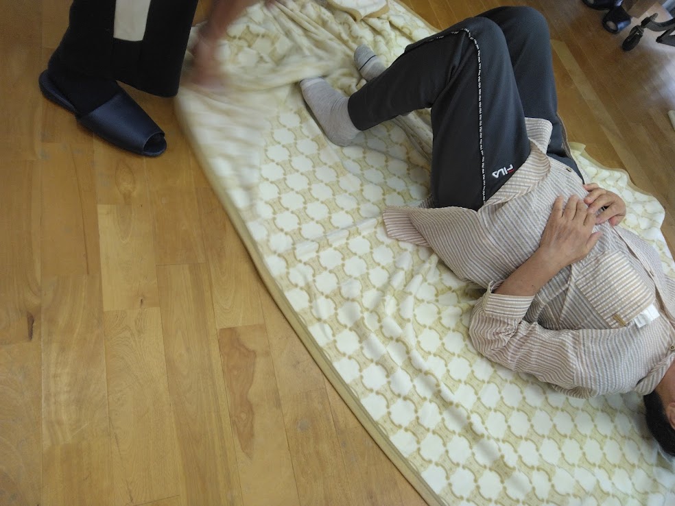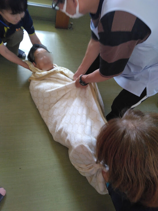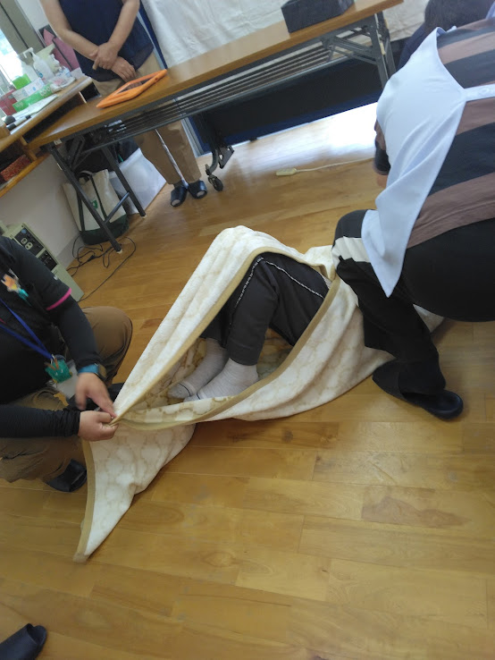 傷病者を毛布で運ぶ方法も学びました(^▽^)/
