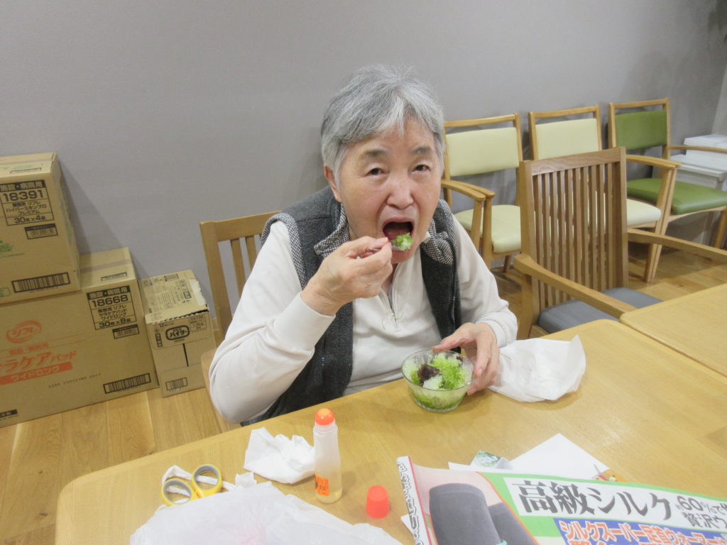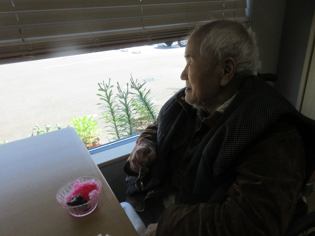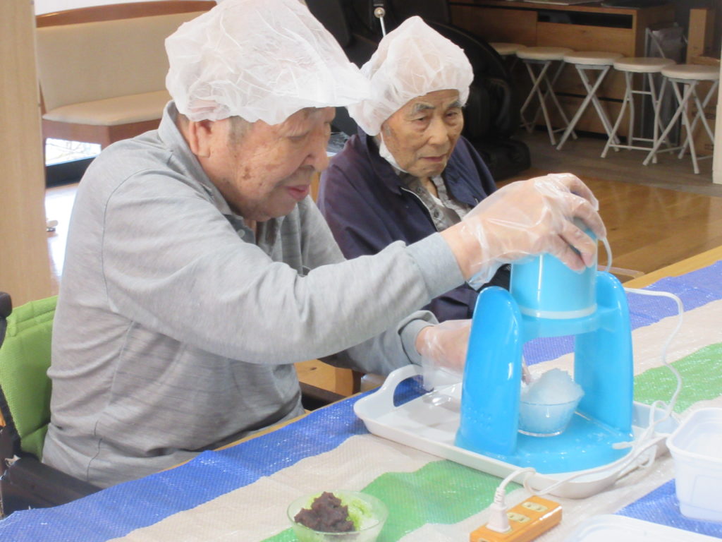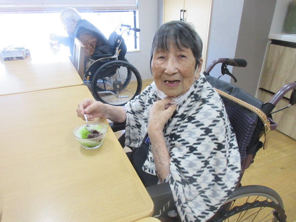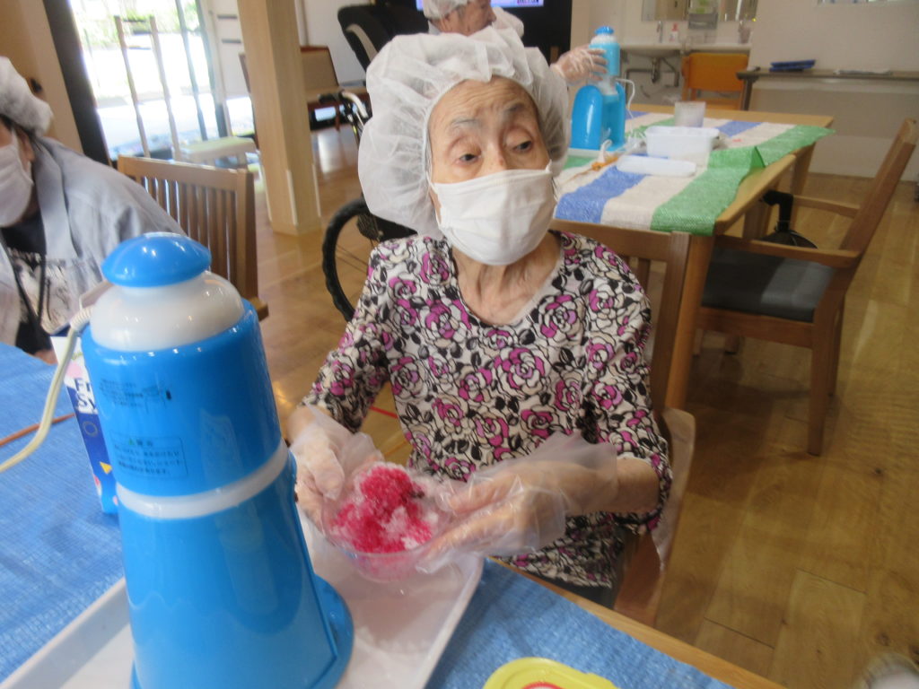 赤と緑のシロップがかかった氷が、目にも鮮やかで、