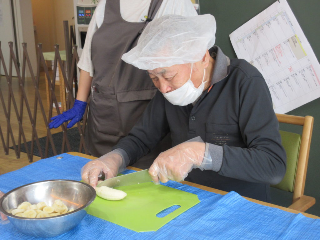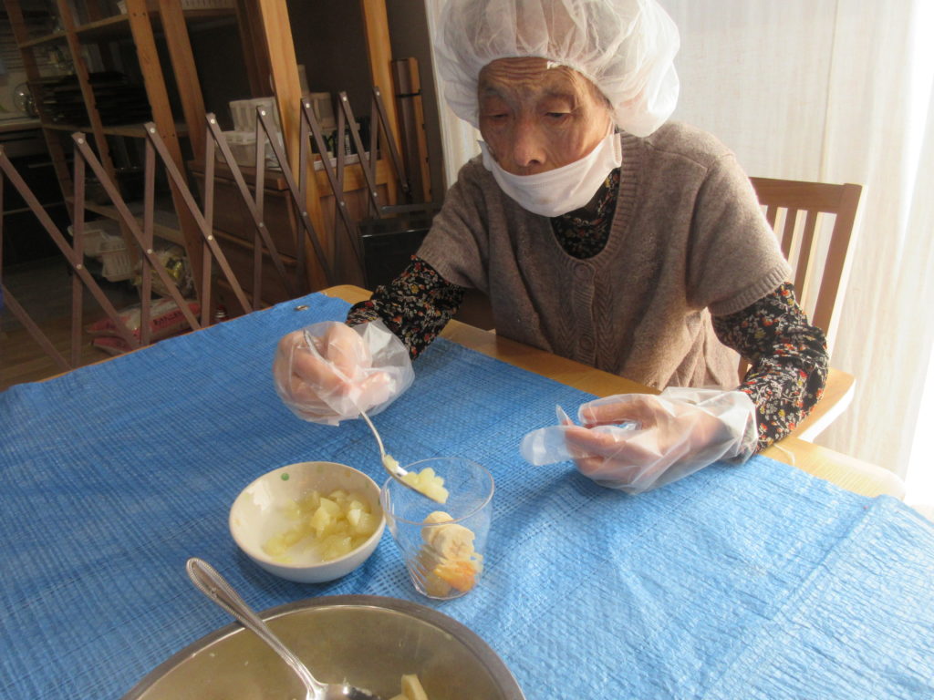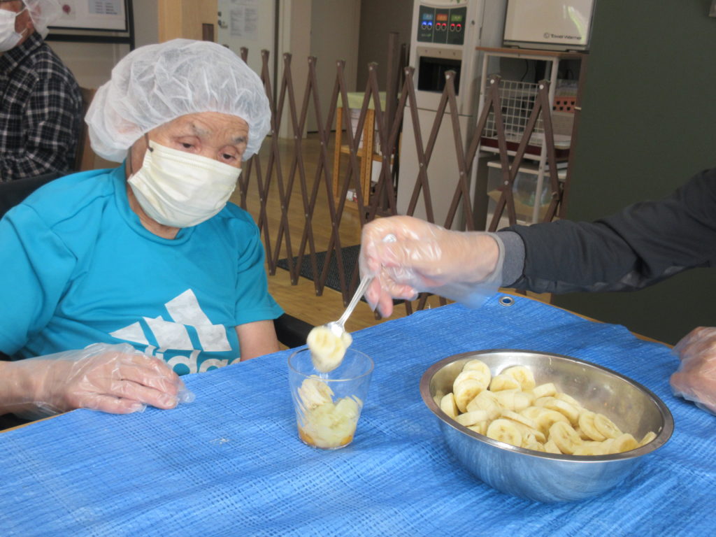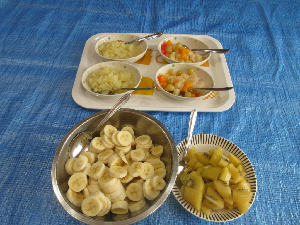 「これはバナナ」「キウイも入れて〜」と、わいわい楽しみながら手を動かします。