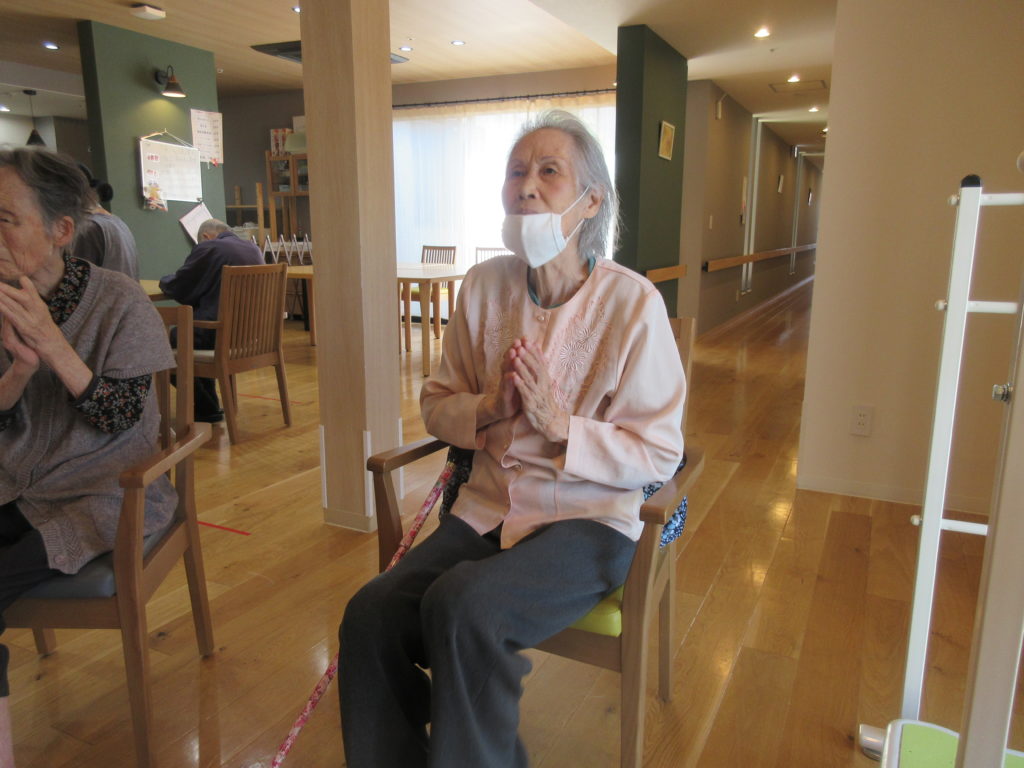 本日のレクリエーションは、映像を見ながら声を出し、身体を動かす“笑いヨガ”。