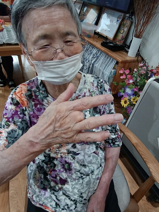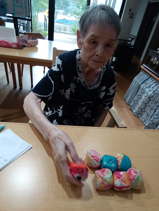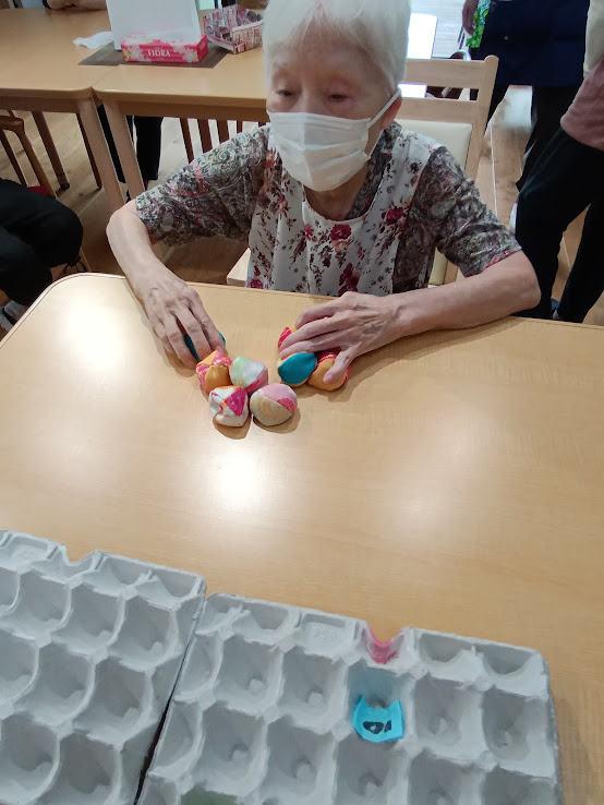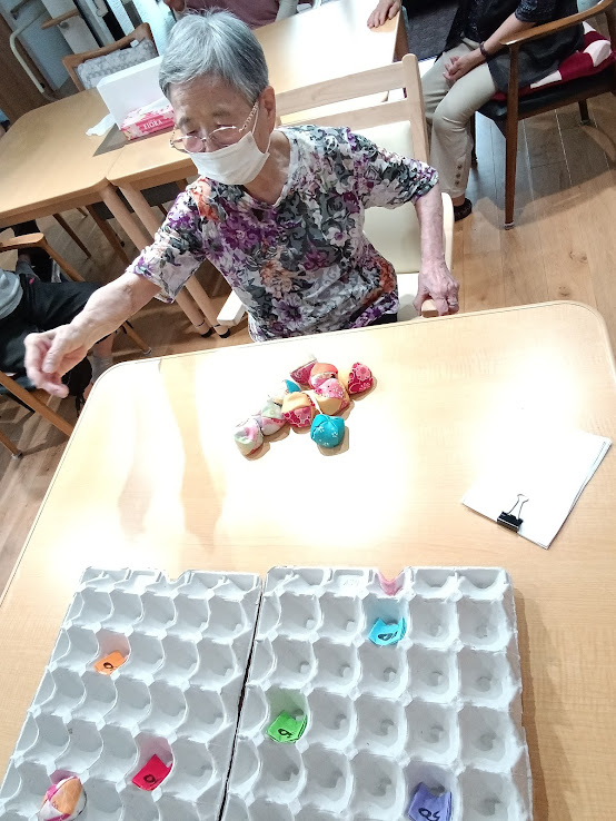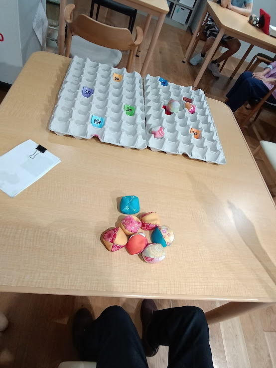 卵が入っていたケースへお手玉を投げ入れていただきます✨