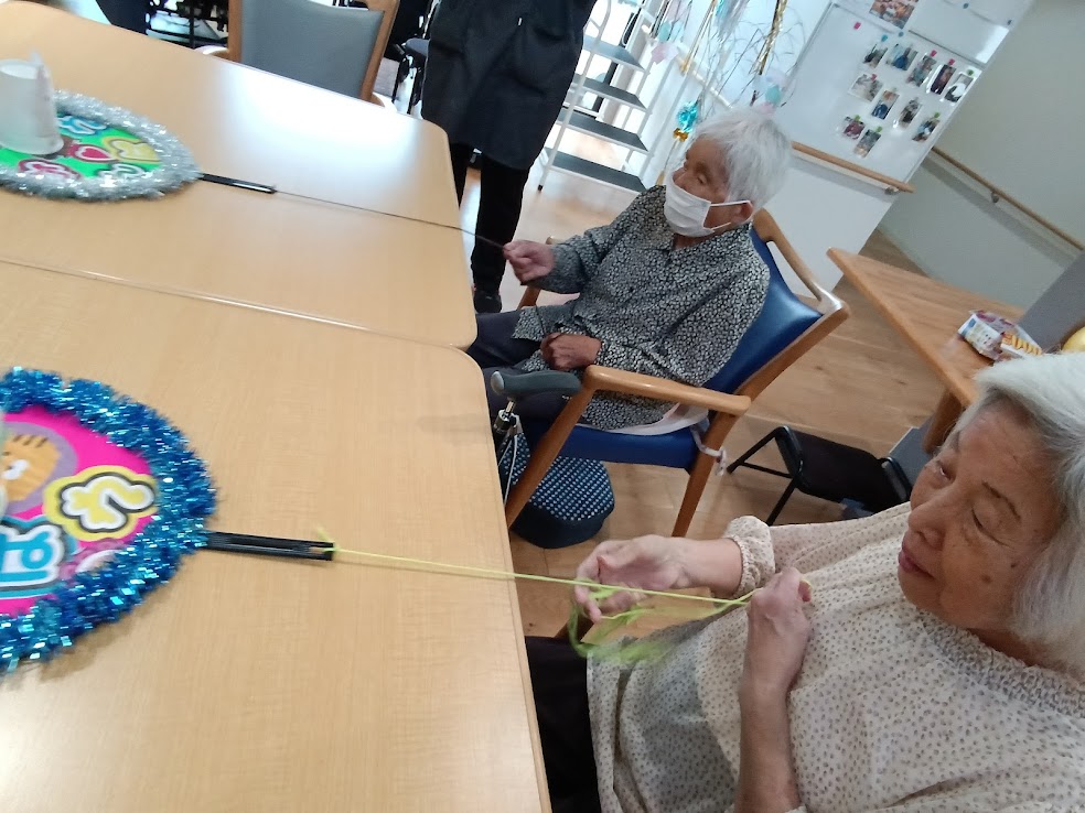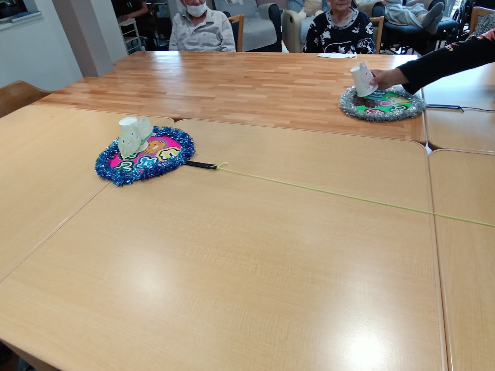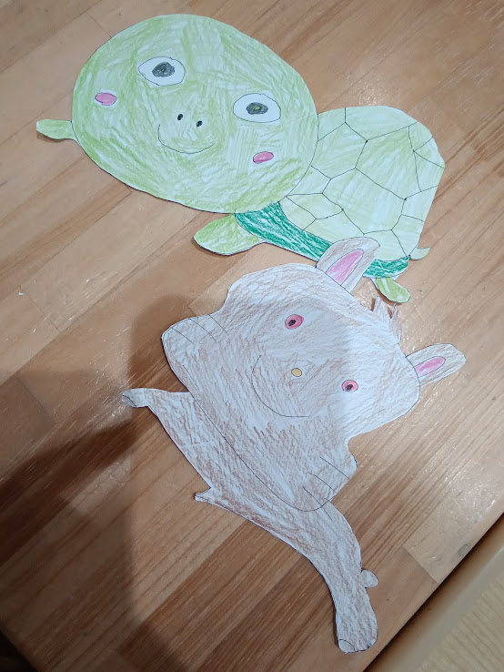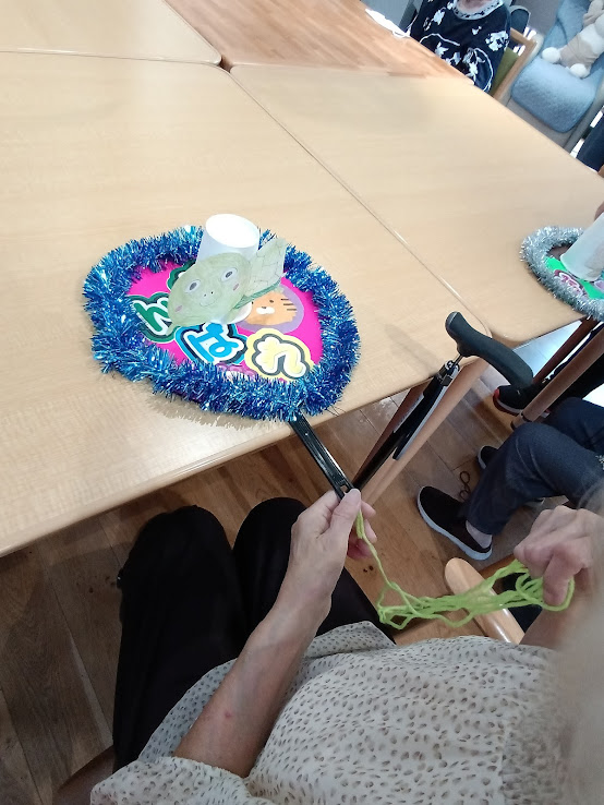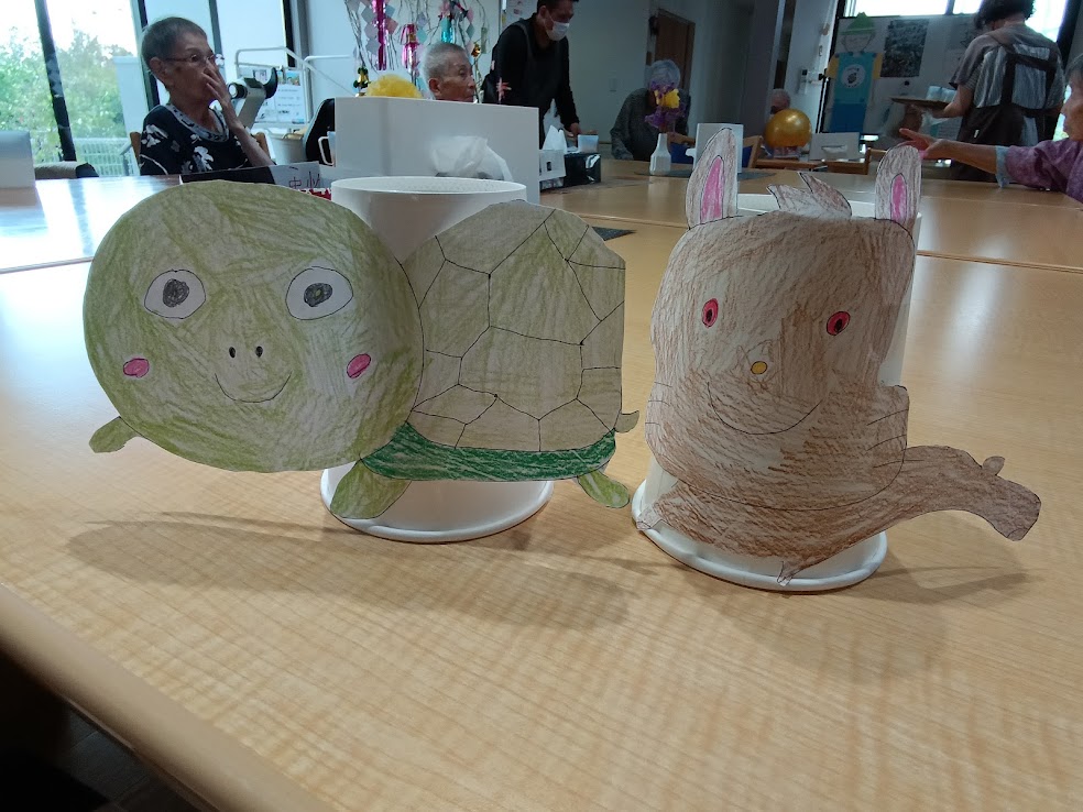 うさぎとカメを貼り付けた紙コップをうちわに置いて、引っ張ります💪