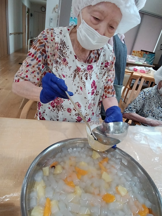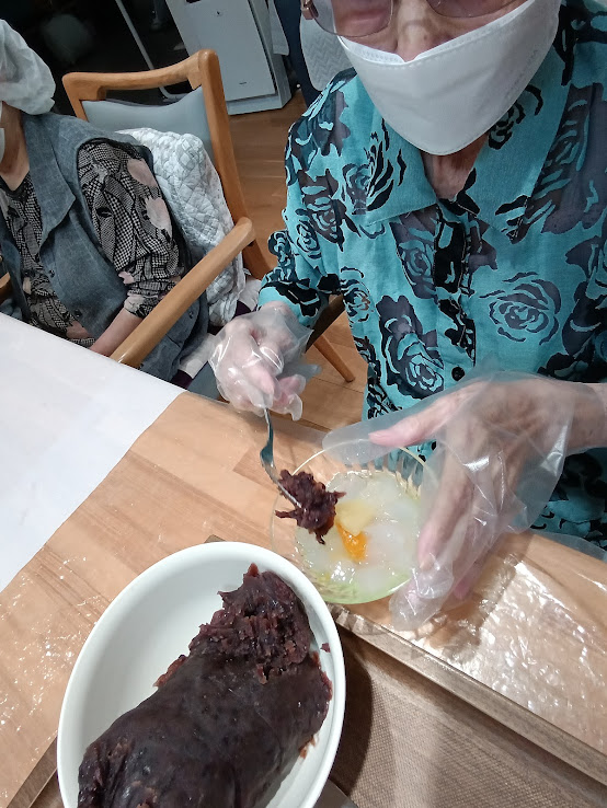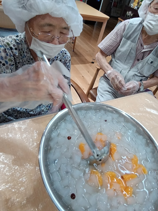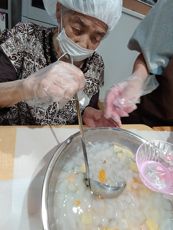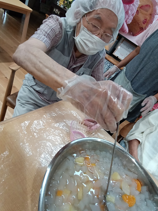 楽しんでいただいた後は、フルーツあんみつ作りです🎵