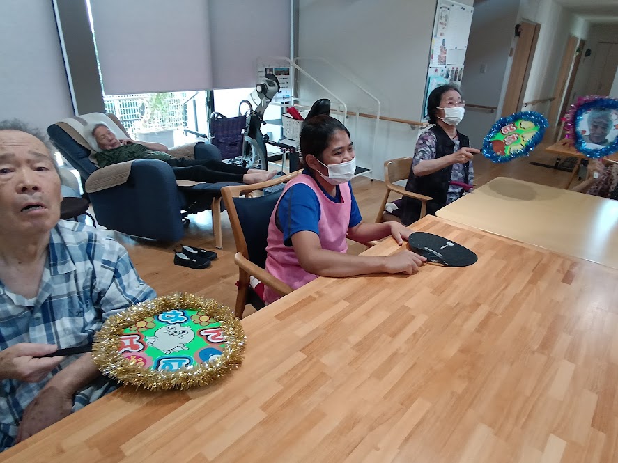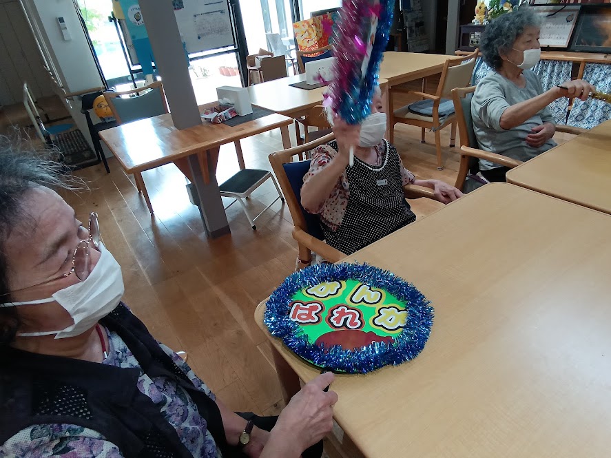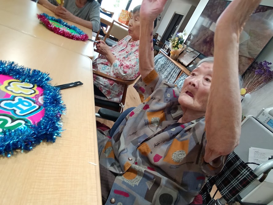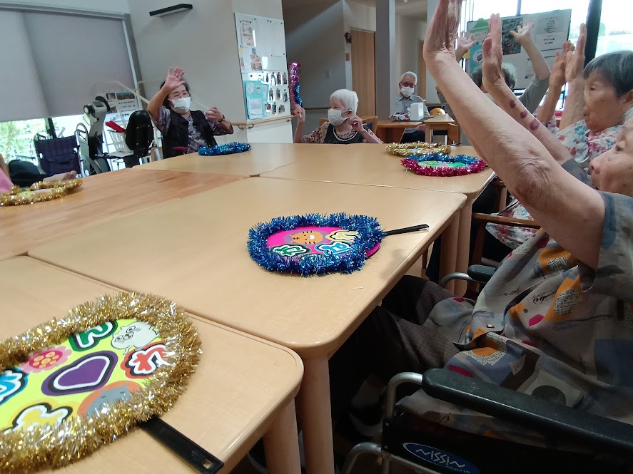 うちわを握る力、腕を伸ばして上を向いてストレッチ…👀