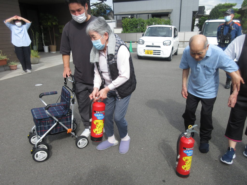 訓練用の水が入っている消火器を使い