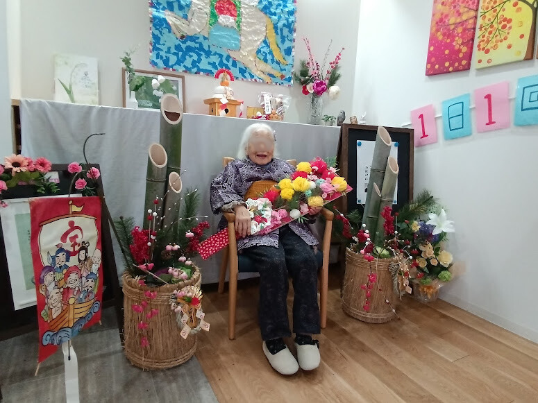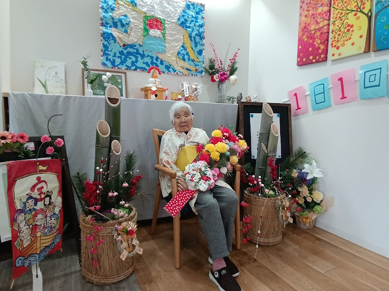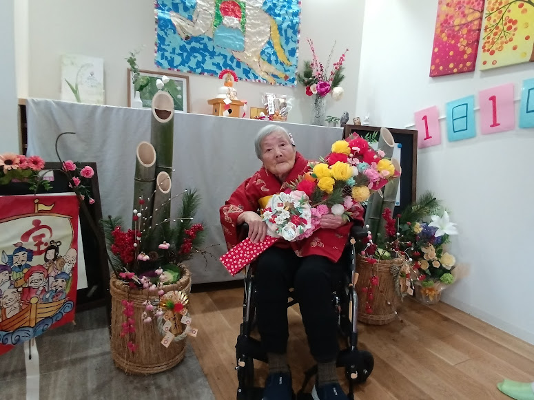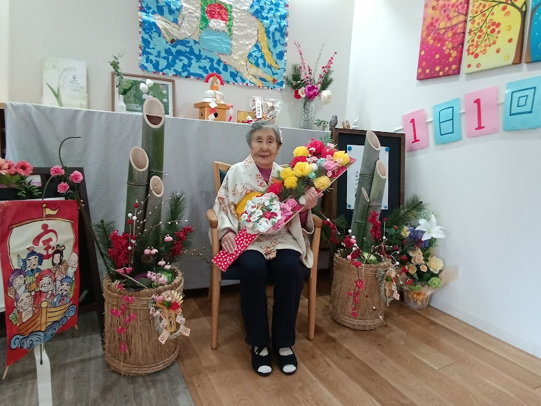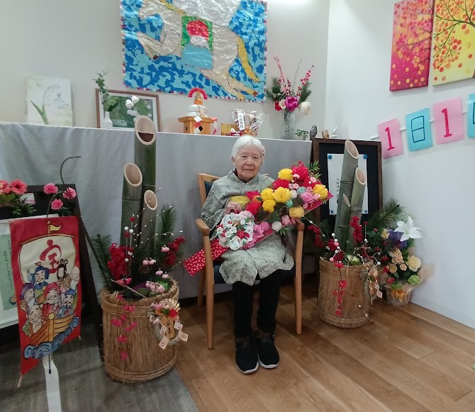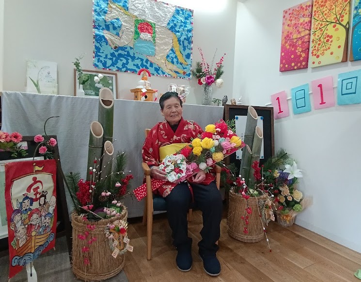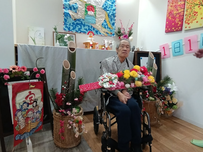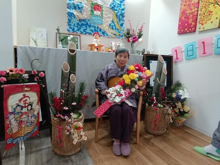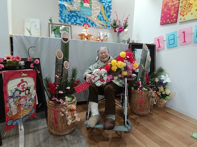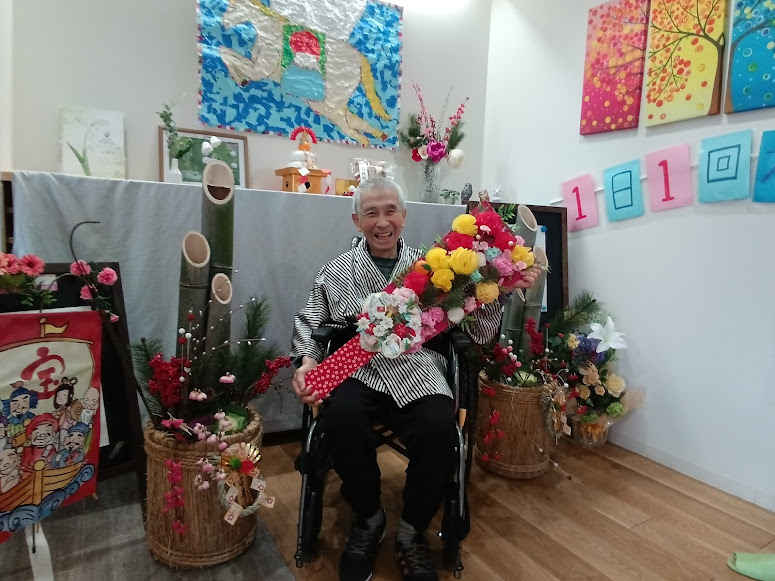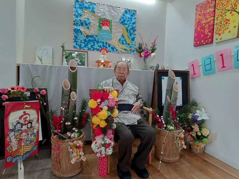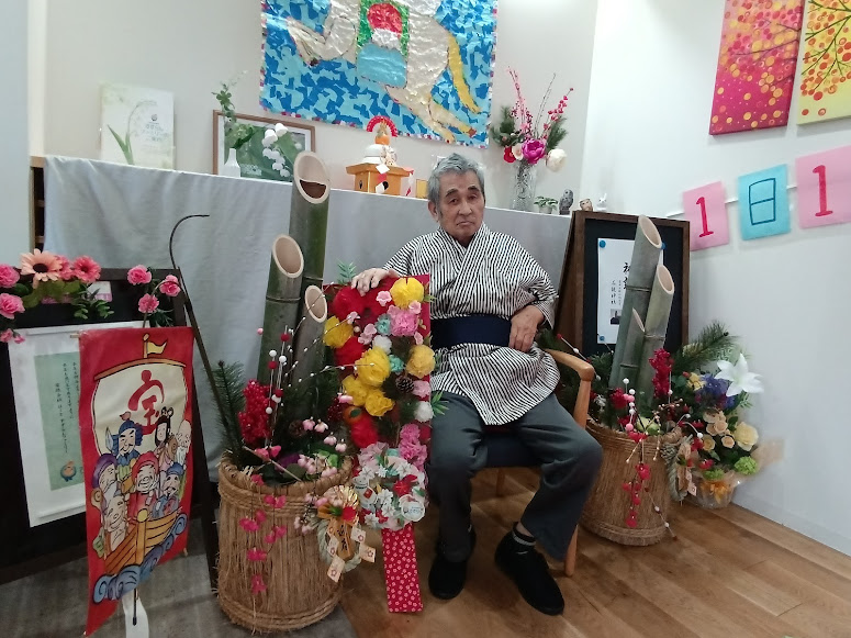 みんなで作った今年の干支の午年の貼り絵をバックに撮りました📷