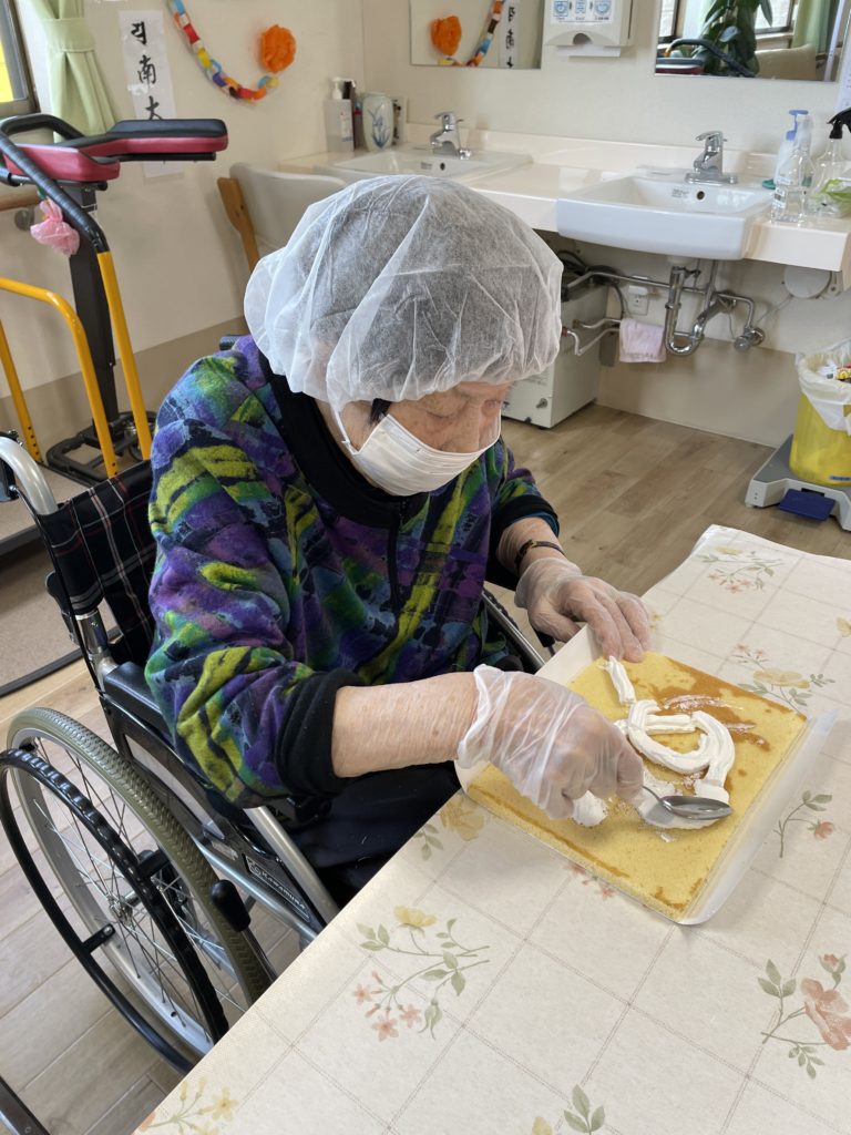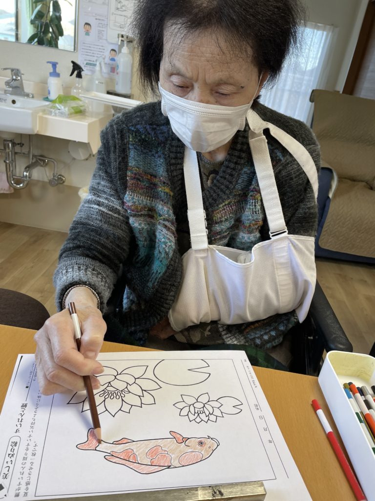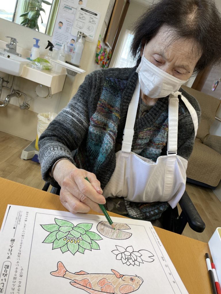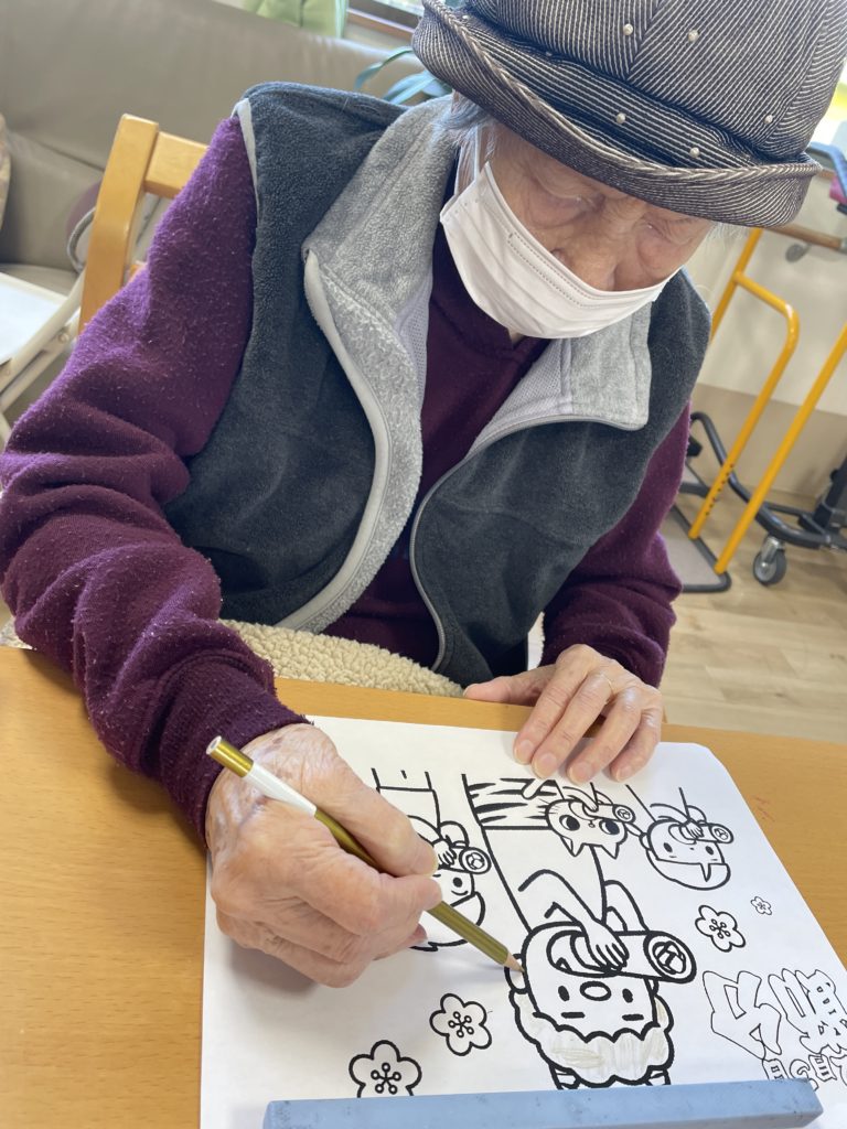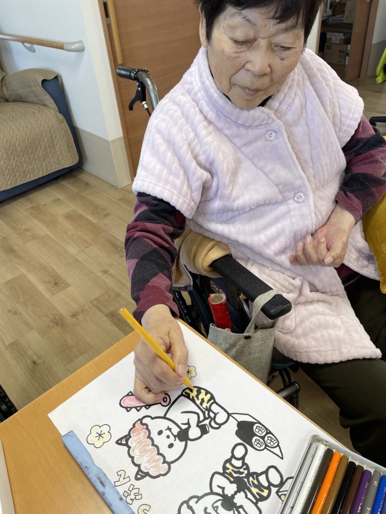 物療をされながらの節分にむけての塗り絵をされている画伯様💛