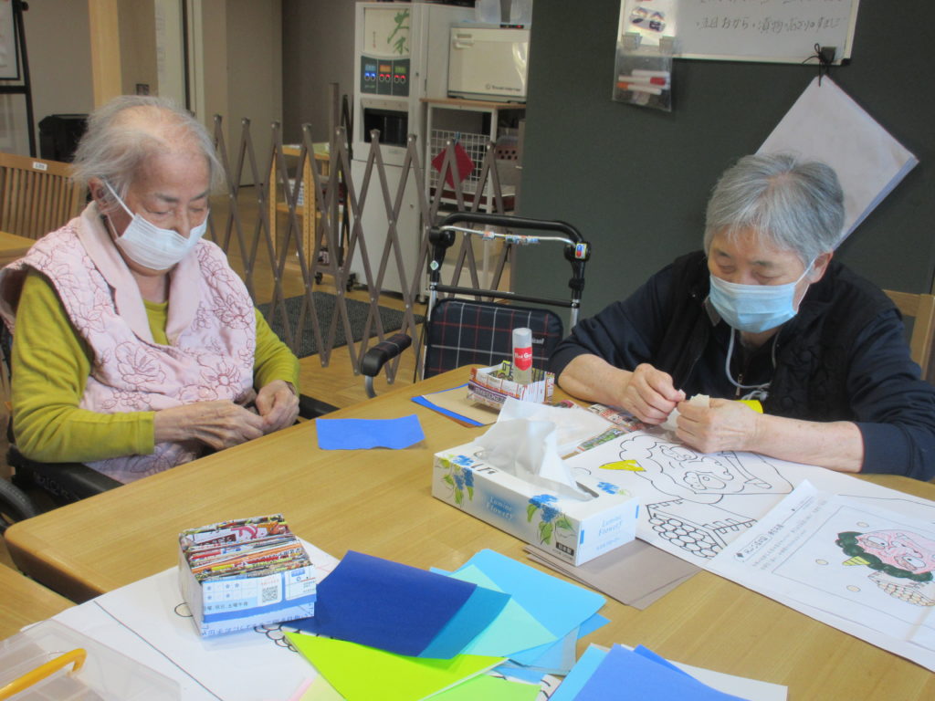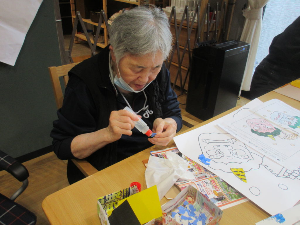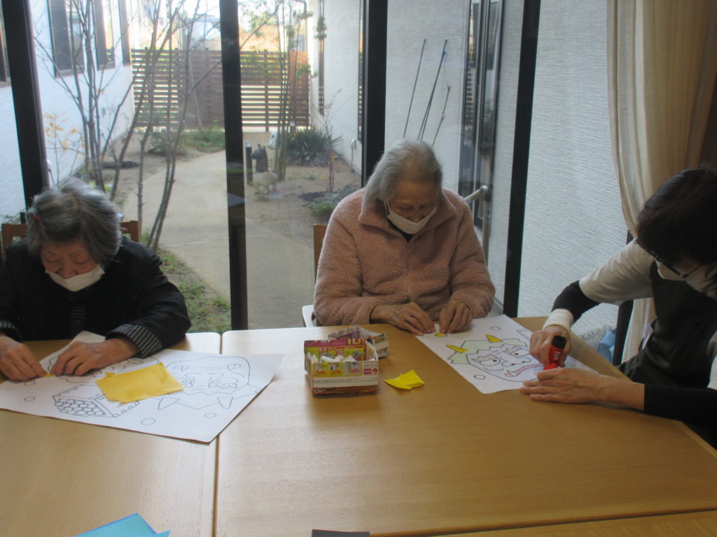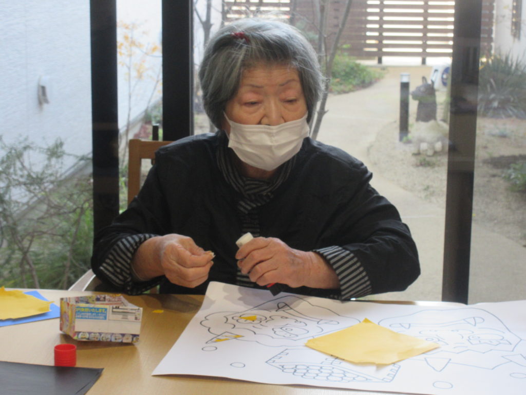 皆様、協力し合いちぎり絵を