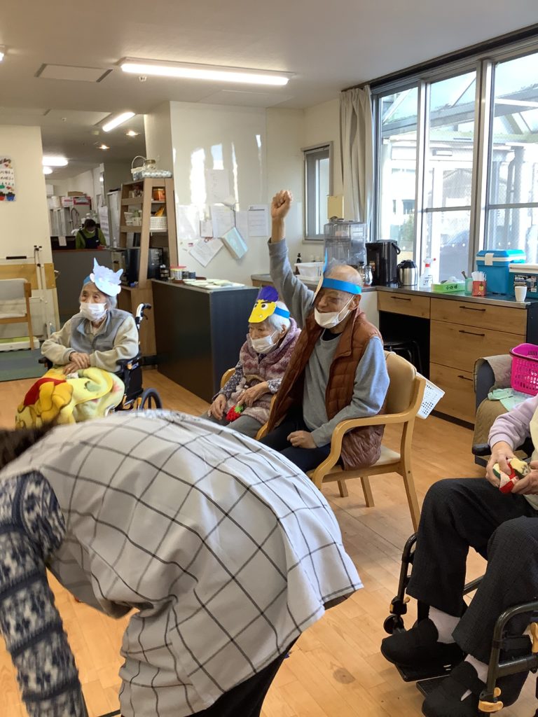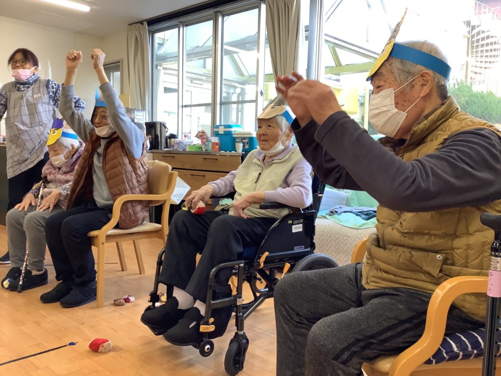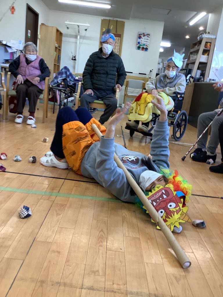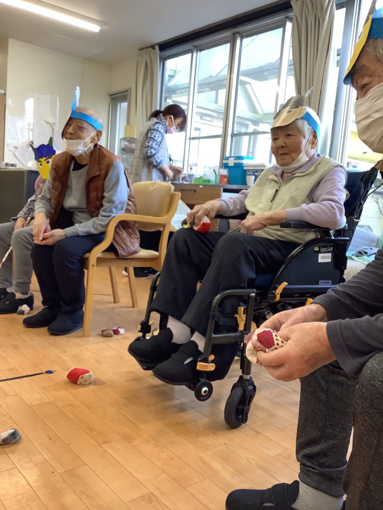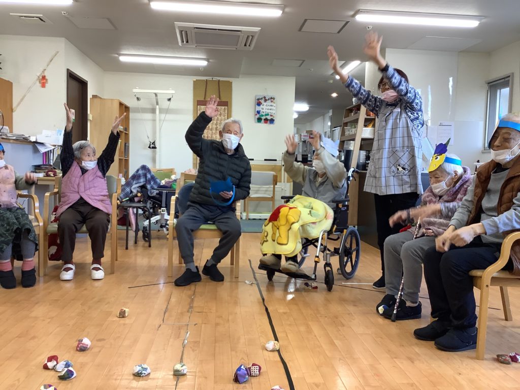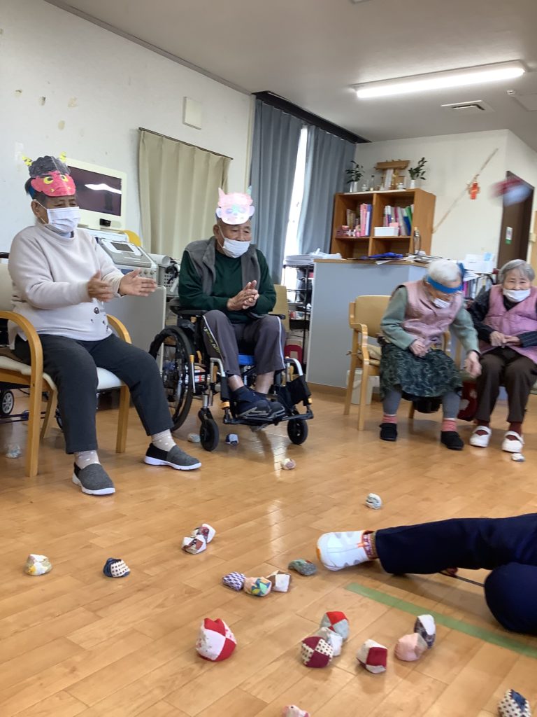 みんなが一丸となって豆の代わりにおじゃみを投げ、ストレスも発散しつつ、必死に鬼に投げました👹