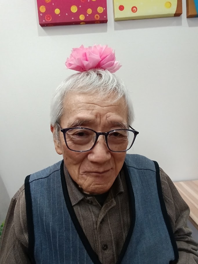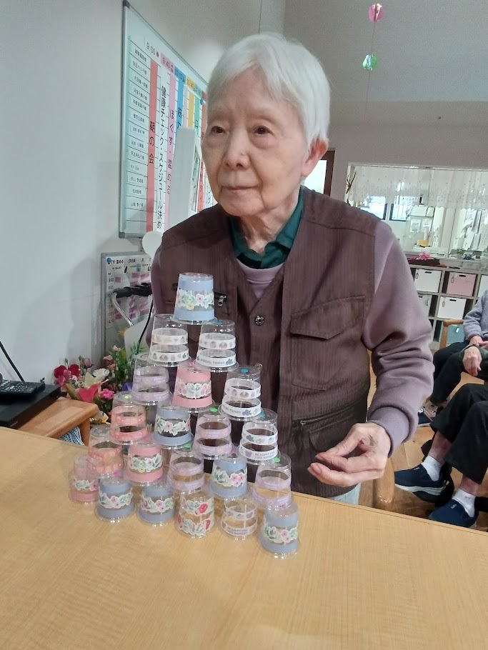 写真撮影の後は、可愛いカップを積み上げるゲームで手指の運動をしていただきました😊