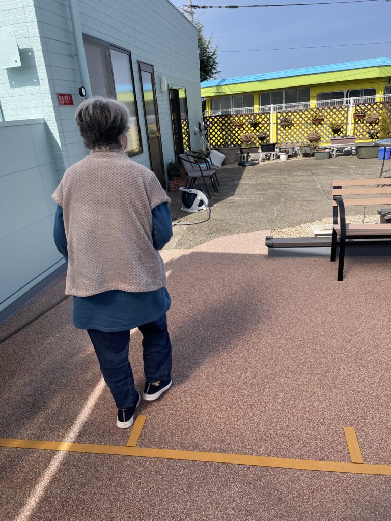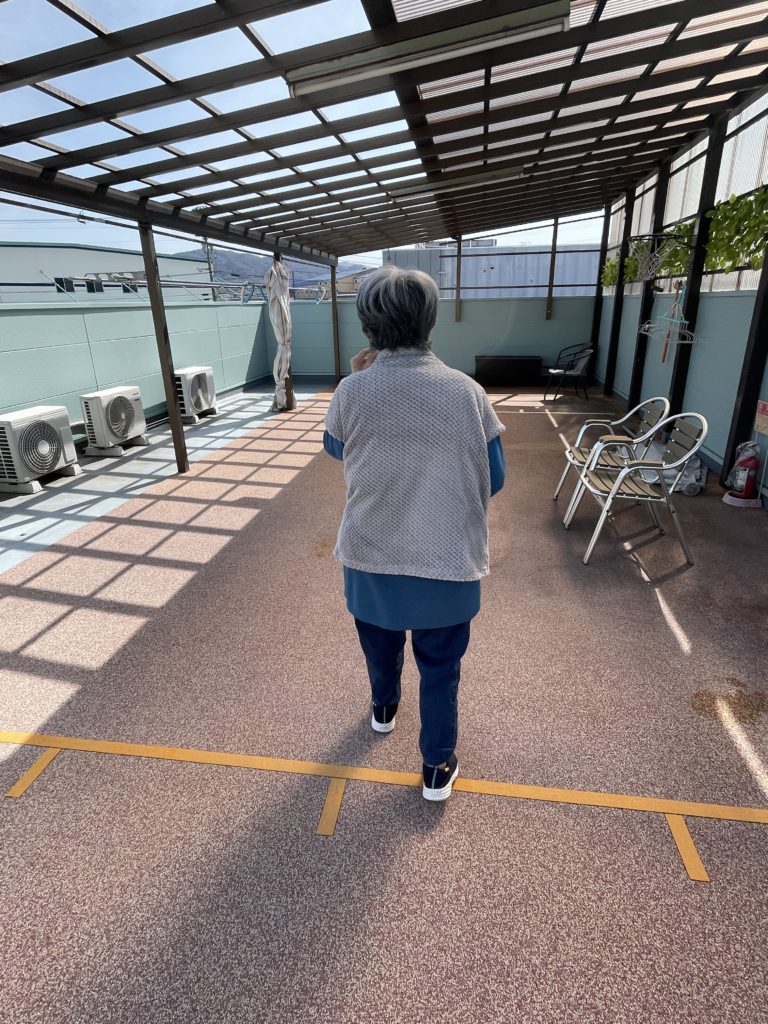 ⑥ 外での歩行訓練☜テラス横断3往復👣