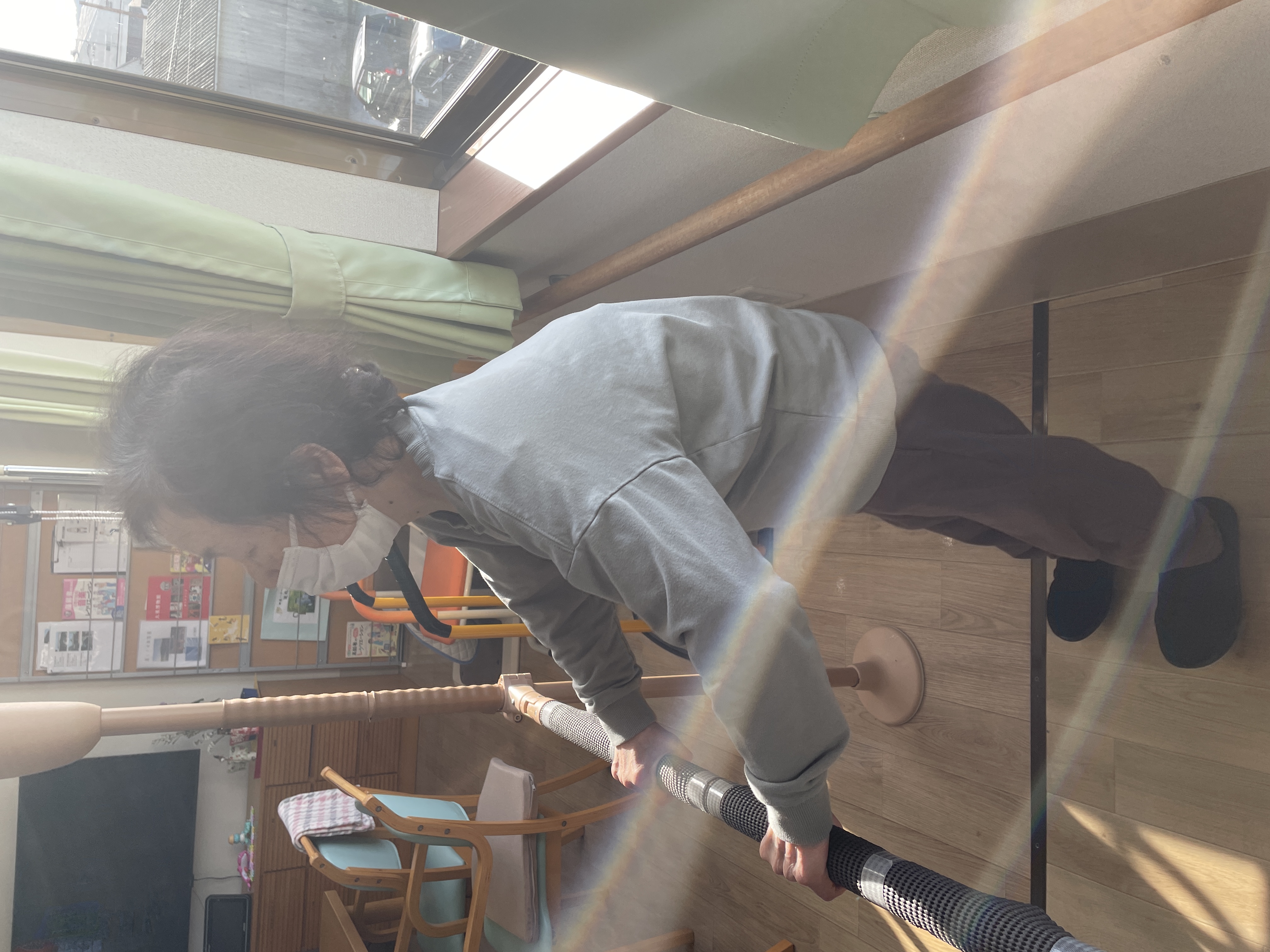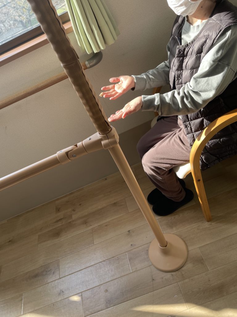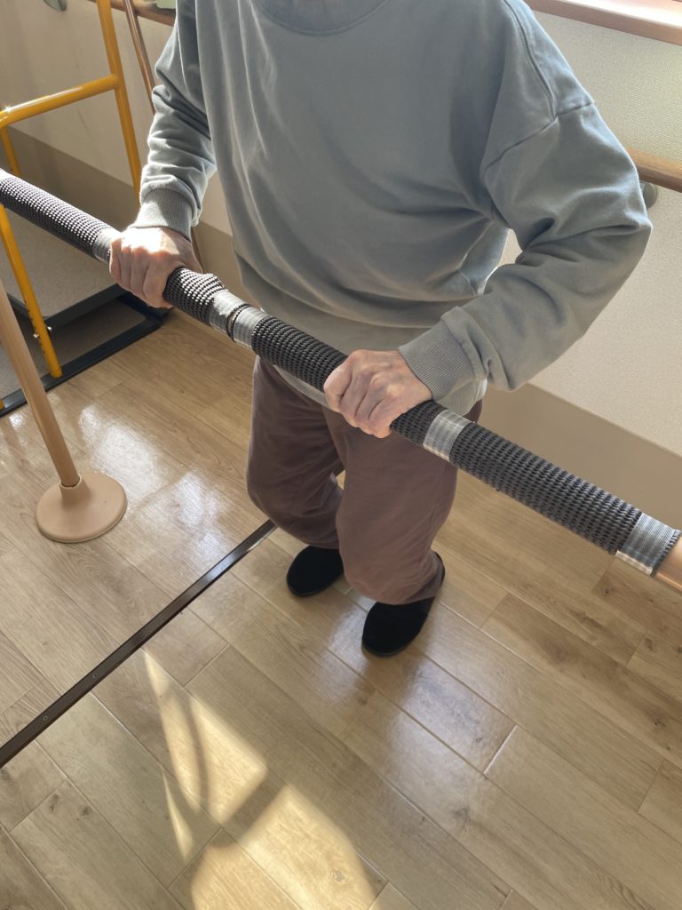 ⤴ 平行棒の縦の手すりをしっかり握っての