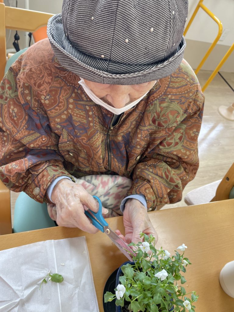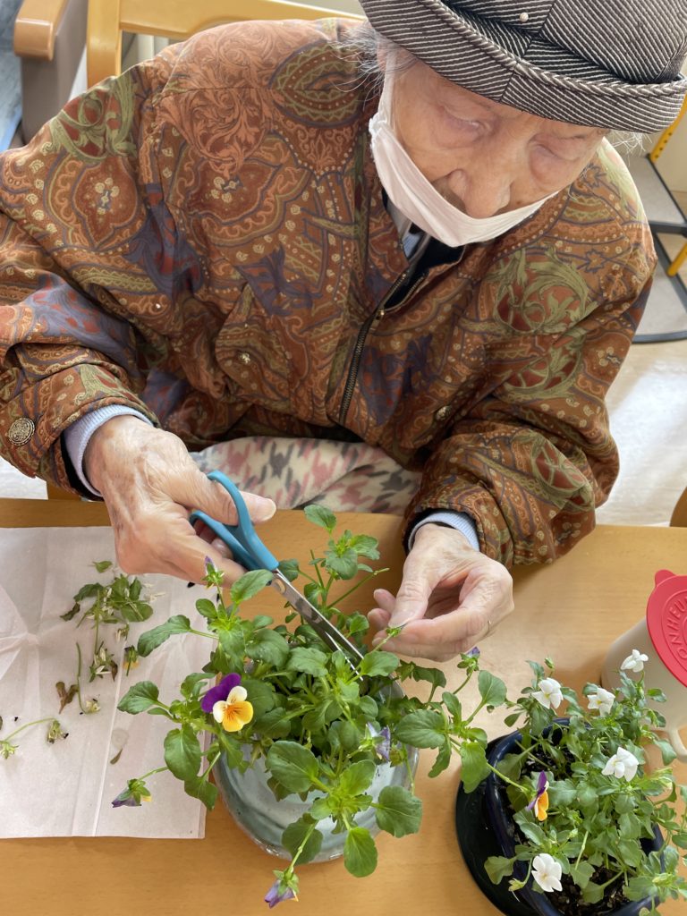 ホールに飾ってあるビオラのお手入れを