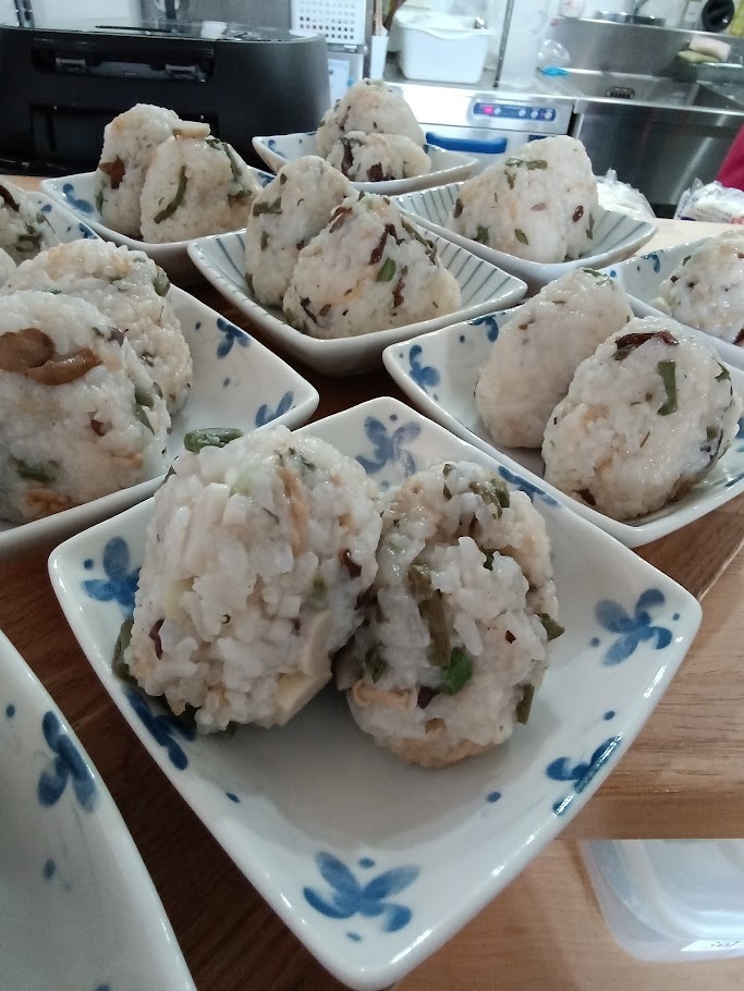 炊きあがった山菜ご飯をおにぎりにしていただきます🍙