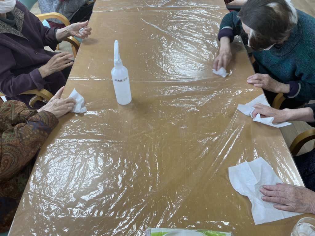 葉っぱ班も~葉っぱの水分をキッチンペーパーで拭き取って頂き
